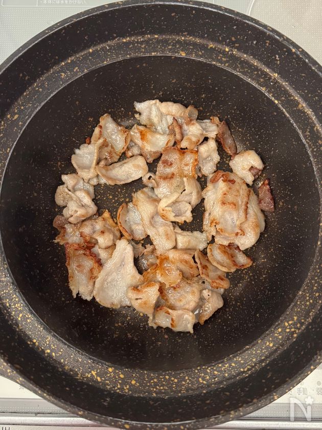 鍋に炒め油を小さじ1引き、豚バラ薄切り肉を炒める。脂が出て、少し焼き色がつくまで、中火でしっかり炒める。余分な油を軽く拭き取る。