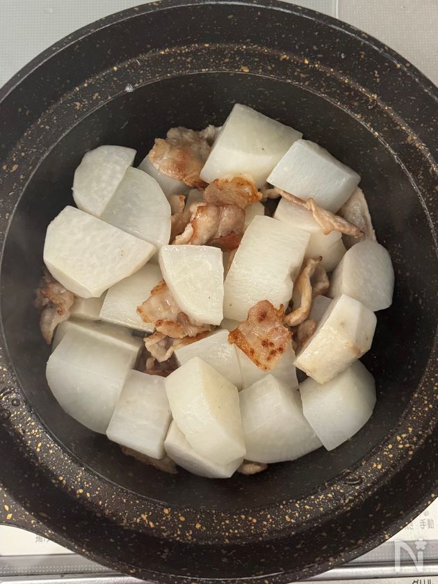 (3) 大根と里芋を入れ、油が回る程度炒める。