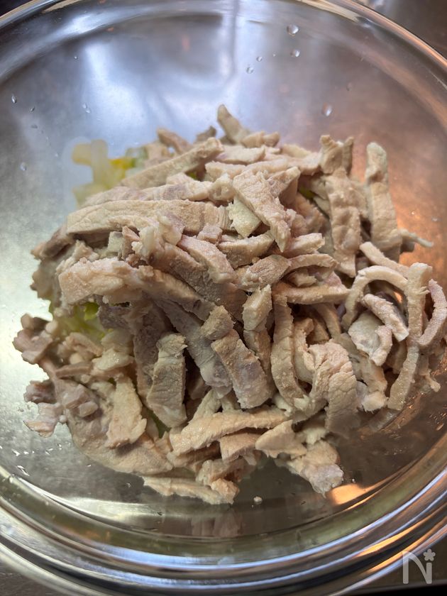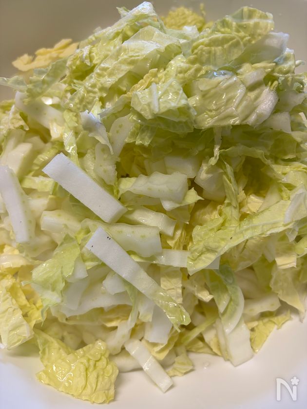(1) 白菜は太めの千切りにして、好みの柔らかさになるまで茹でる。