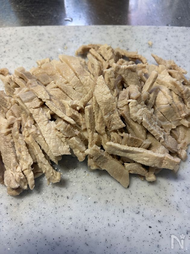 (2) 豚ロース肉(生姜焼き用) は、中に火が通るまで茹で、白菜と同じくらいの太さに切る。