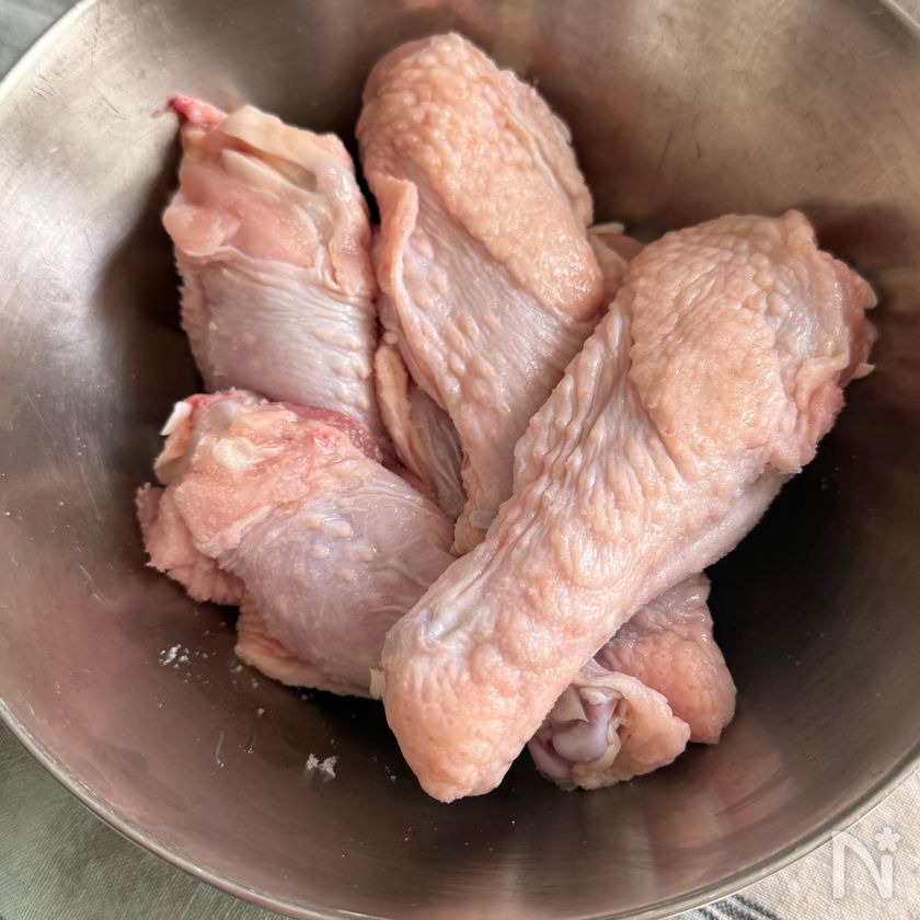 (下準備) 鶏手羽元は塩小さじ1/2をもみこみ、30分から1時間おく。
