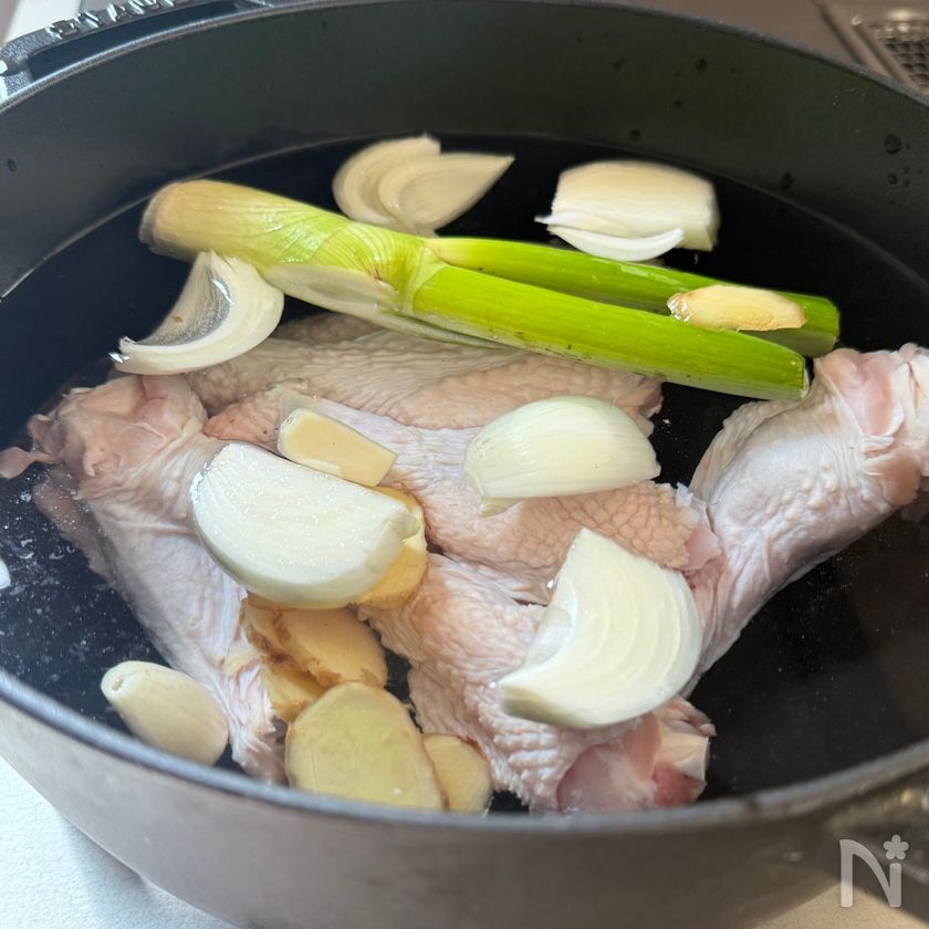 (2) 鍋に鶏手羽元、水、玉ねぎ、白ねぎ、しょうが、にんにくを入れて火にかける。
