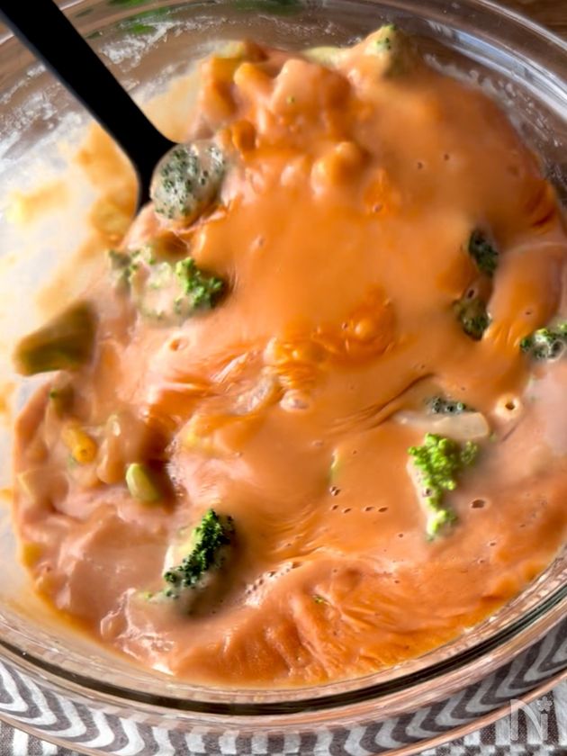 (11) よく混ぜ合わせ、グラタン皿に流し入れ、ピザ用チーズをのせる。