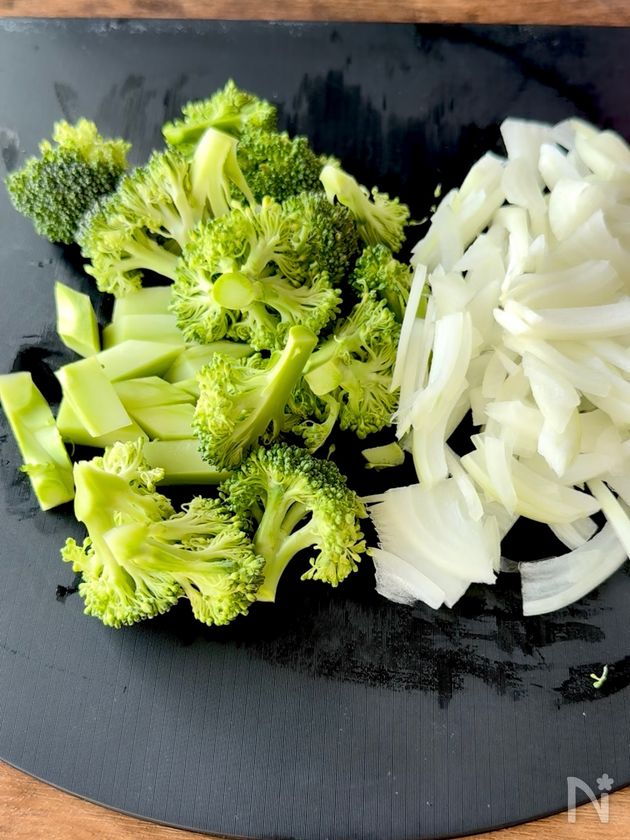 (1) 玉ねぎは薄切りにする。ブロッコリーは小房に分け、芯は皮をむいて食べやすい大きさに切る。