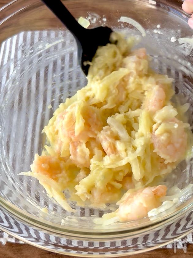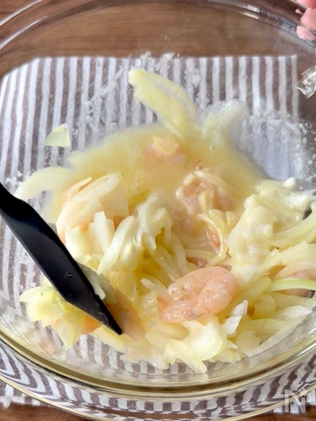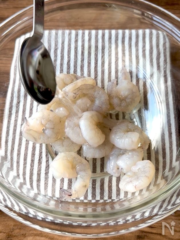 (2) 耐熱ボウルにむきえびを入れ、【A】で下味をつける。