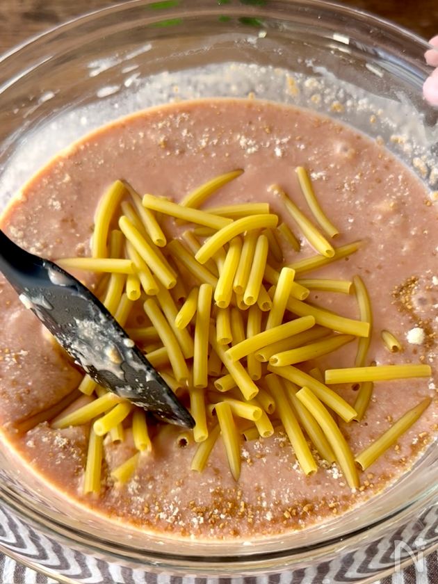 (9) マカロニ(早茹で3分)・ブロッコリーを入れ、全体をよく混ぜる。