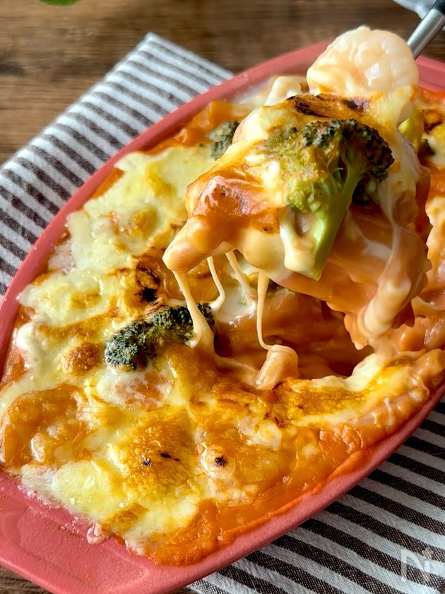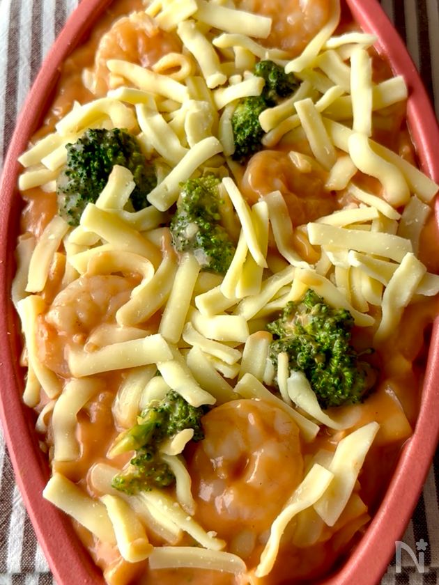 【えびトマトクリームグラタン】レンジで簡単!火を使わない♪