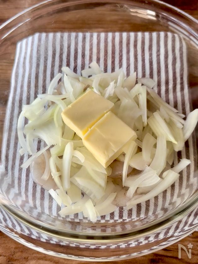 (3) むきえびの上に玉ねぎを重ね、バターをのせる。