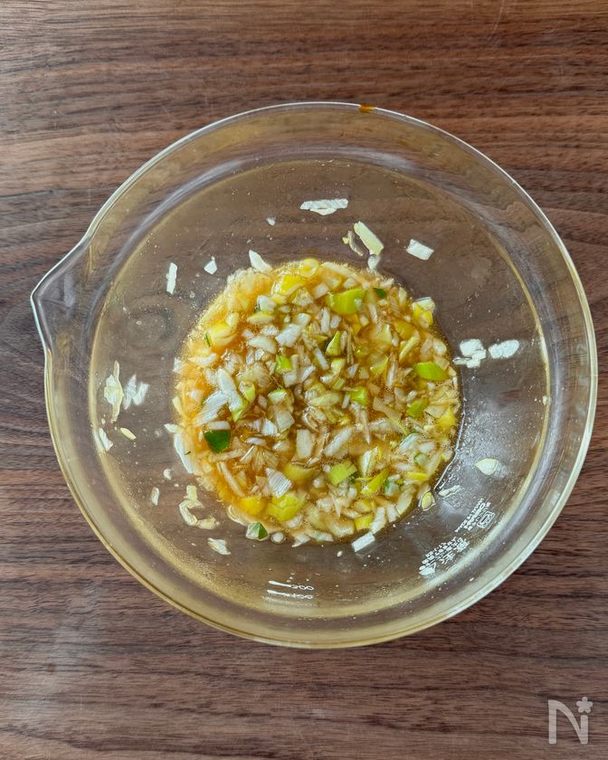 (3) 耐熱ボウルに【A】と長ねぎ(みじん切り)を入れて混ぜ合わせ、電子レンジ(600W)で1分加熱し、タレを作る。