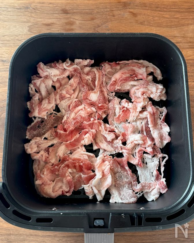 (1) COSORI TurboBlaze™ 6.0Lノンフライヤーは205℃に予熱する。豚バラ薄切り肉は食べやすい大きさに切り、塩、こしょう、片栗粉を全体にまぶす。