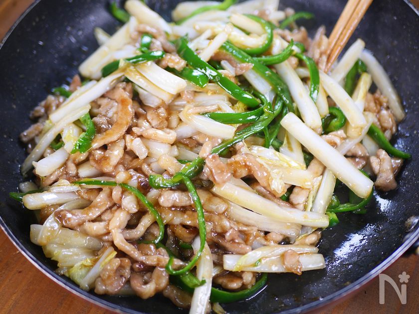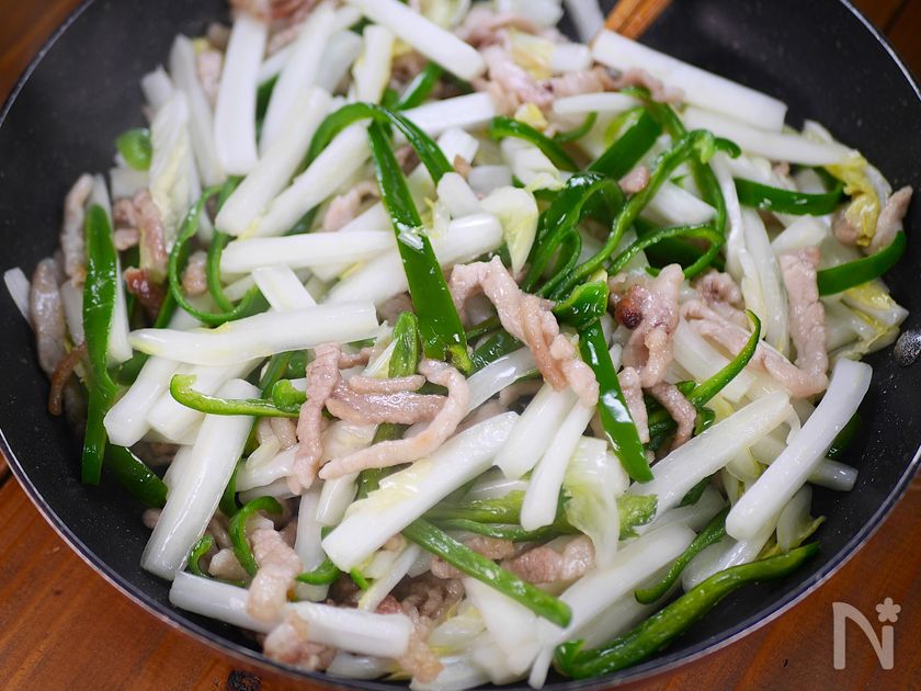 (3) 白菜、ピーマン、塩(ひとつまみ、分量外)を加え、強火で2分ほど炒め合わせる。