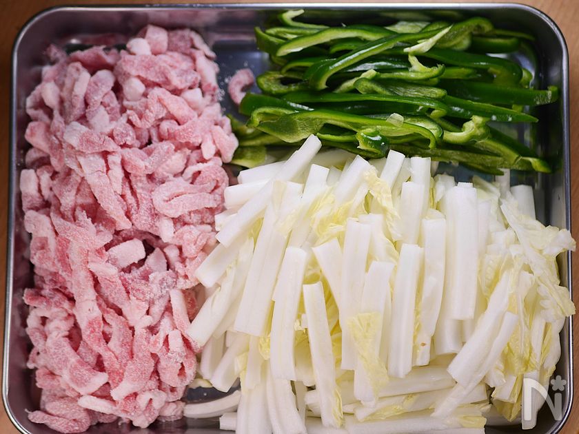 (1) ○豚薄切り肉(生姜焼き用)は細切りにし、片栗粉をまぶす(大きめのポリ袋に入れてシャカシャカしてまぶすとラク♪)