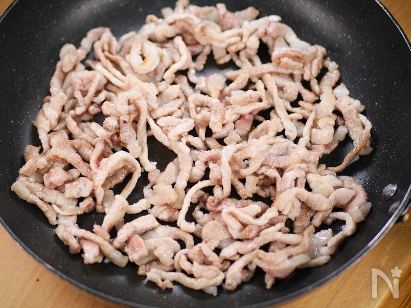 (2) フライパンにサラダ油(大さじ1、分量外)を強めの中火で熱し、豚肉を炒めて火を通す。