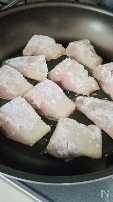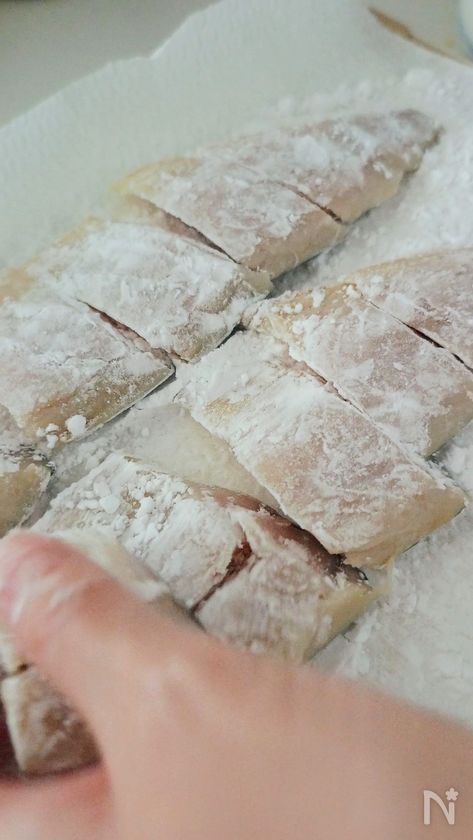 (2) 塩さばはサッと水で洗い表面の水分を拭き取り、食べやすい大きさにカットし、片栗粉を薄くまぶす。