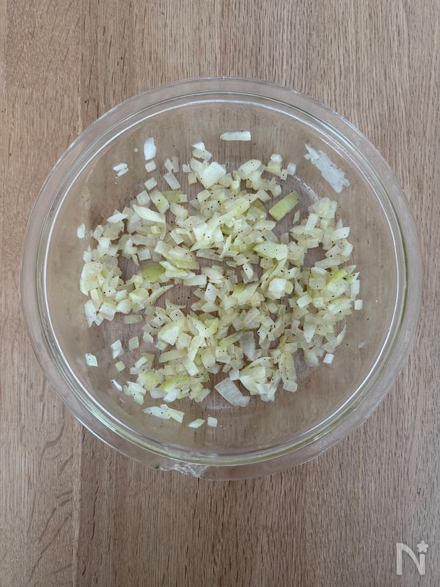 (下準備) ・玉ねぎ(みじん切り)を耐熱容器に入れ、ラップをせずに、電子レンジ(600w)で、2分30秒加熱し、冷ます。