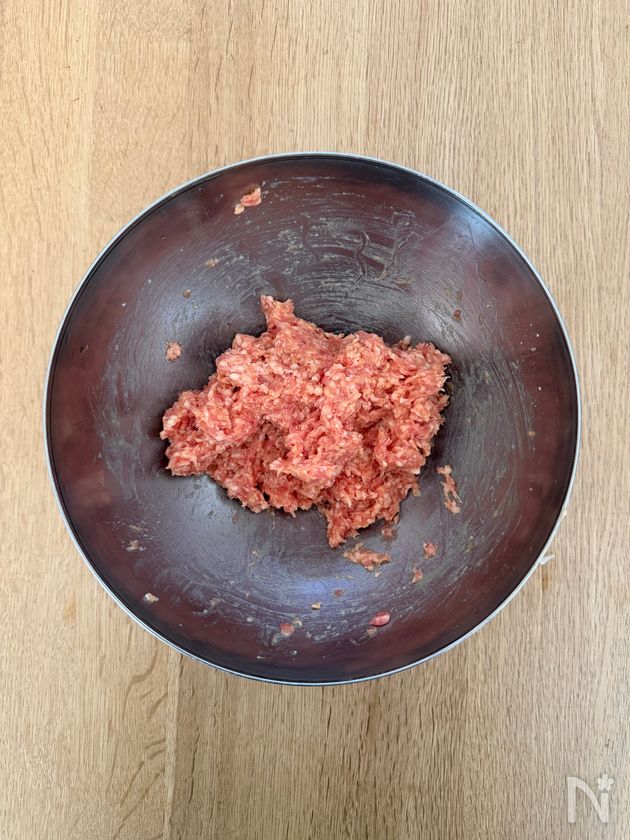(1) ボウルに、豚ひき肉と【A】を入れ、粘りが出るまで、しっかりこねる。