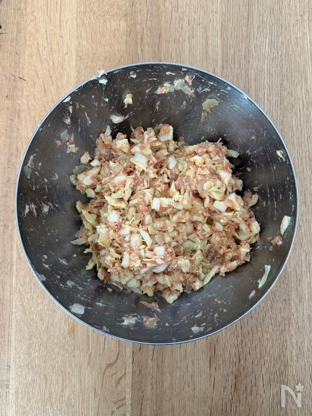 (2) 冷ました玉ねぎと春キャベツ(みじん切り)をいれ、キャベツがしんなりして、しっかり混ざるまでこねる。