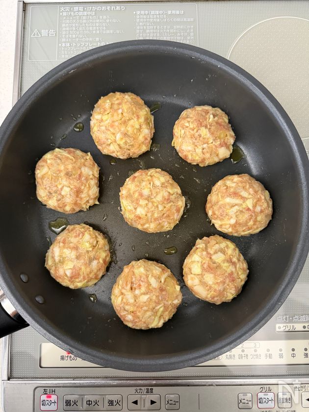(3) 8等分にし、丸めたら、炒め油小さじ1を引いたフライパンに並べる。弱火~弱めの中火で、5分加熱する。
