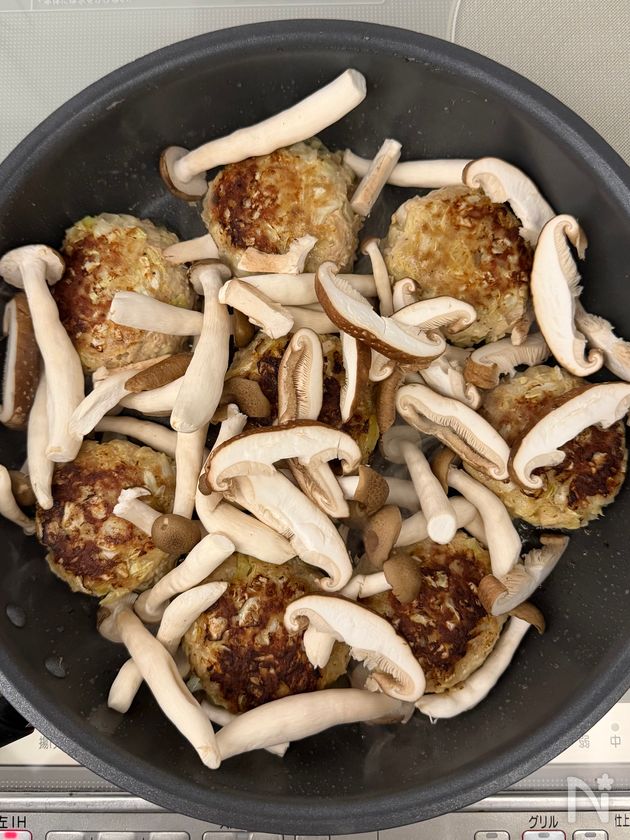 (4) 裏返し、しめじとしいたけを入れ、蓋をして、更に4分加熱する。