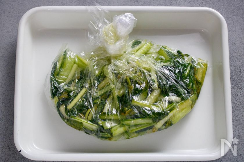 (1) 小松菜は3〜4cm長さのザク切りにし、ポリ袋に入れる。塩小さじ1を加えてよく揉み込む。(時間があれば、ここで10分ほどおく)
