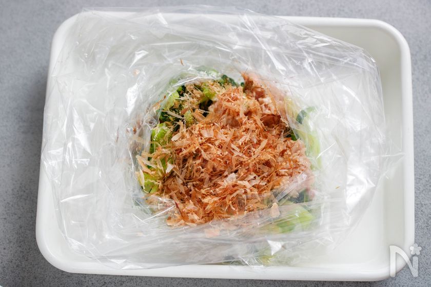 (3) 粗熱が取れたら水気を絞り、ポリ袋に入れる。ツナ缶(油ごと)・【A】を入れて、上下にふって完成!