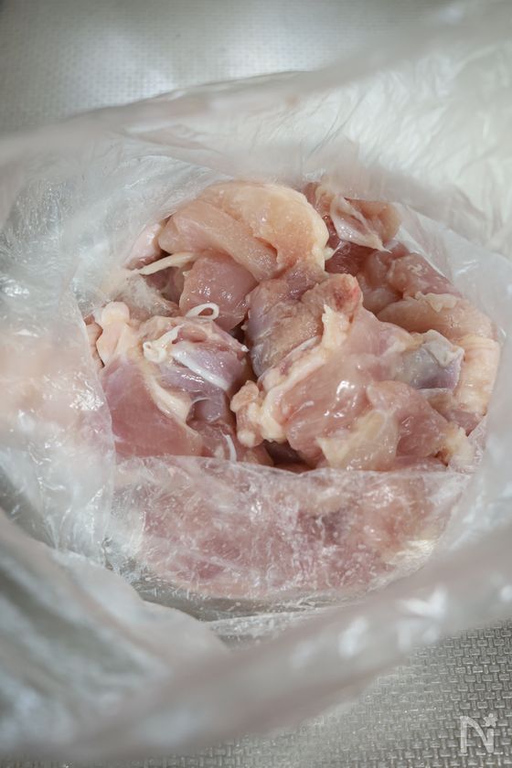 (1) 鶏もも肉はひとくち大に切り、酒、片栗粉を揉み込む。