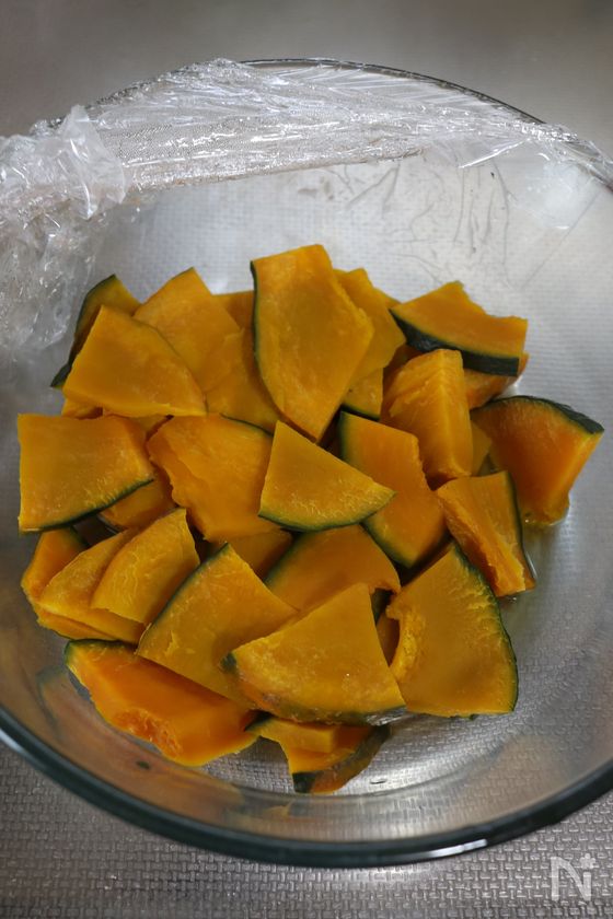 (2) かぼちゃは種、わたをとったら幅5mm程度の薄切りにし、ひとくち大に切る。耐熱ボウルに入れ、水大さじ1(分量外)を加えてラップをし、600Wのレンジで3分加熱する。