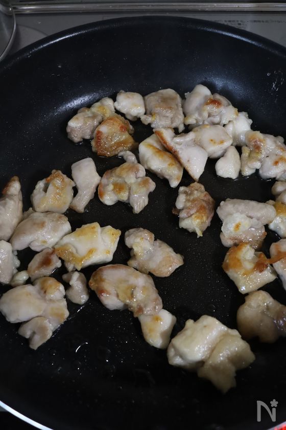 (3) フライパンにサラダ油をひき、①の鶏肉を中火で両面こんがりするまで焼いたら、蓋をして弱火で3分程焼き中まで火を通す。