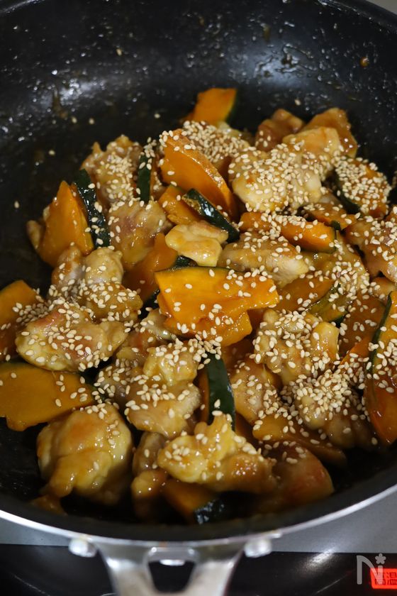 (4) 中火に戻して②のかぼちゃを加えてさっと炒め合わせたら、【A】を合わせて加え、汁気を飛ばしながら照りが出るまで煮からめる。