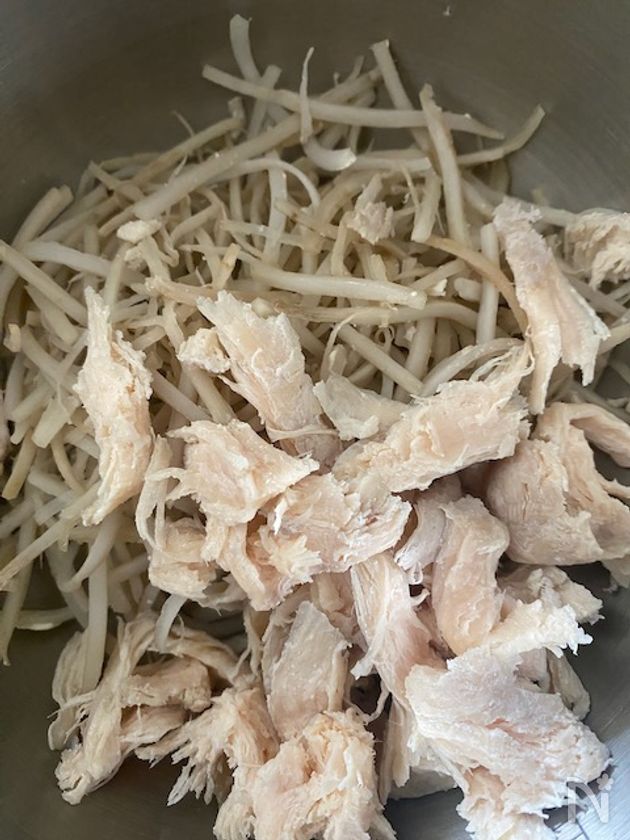 (1) 水気をしっかり切ってささみは細かく割く