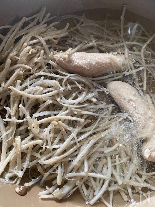 (下準備) 細切りごぼうとささみは熱湯で5分ぐらい茹で