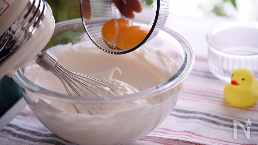 ※メレンゲを作る際卵黄が少しでも混じってしまうとメレンゲが出来ないので、そんな時は全卵に砂糖を全量入れてボウルの底を湯煎して、混ぜると上手く泡立ちます。