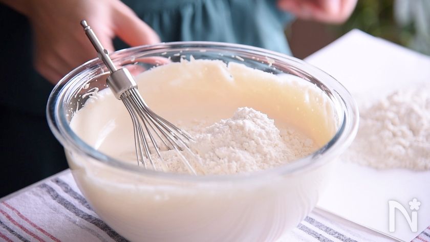 (8) ふるっておいた薄力粉を3回に分けて入れます。