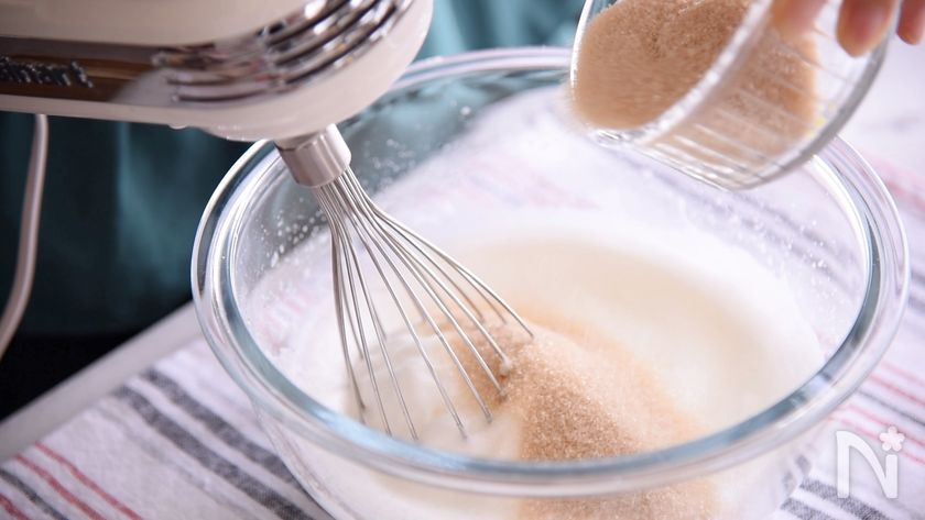 (5) 白っぽくなれば砂糖を3回に分けて入れて高速で程混ぜます。