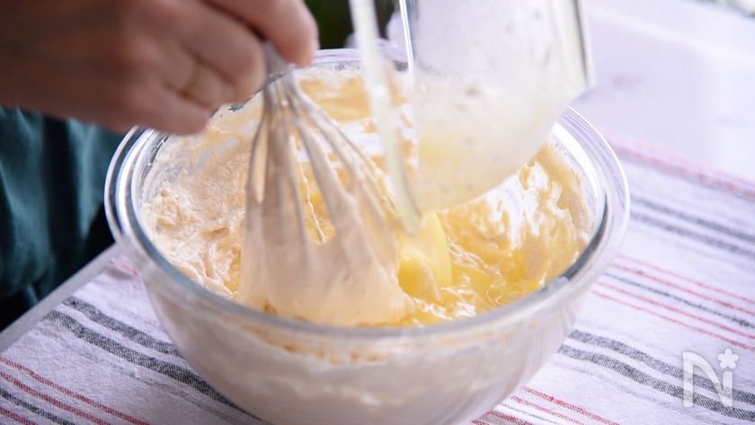 (9) 粉がだいたい混ざってきたら、溶かしておいたバターを泡立てた卵に入れて混ぜます。