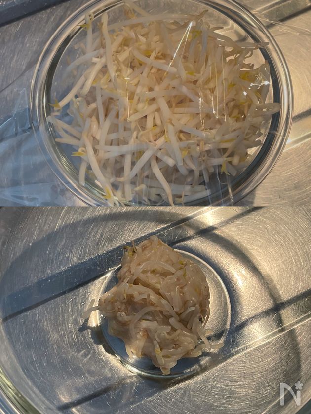 (1) もやしは600wのレンジで5分加熱し、水にさらして冷やしてよく絞る。