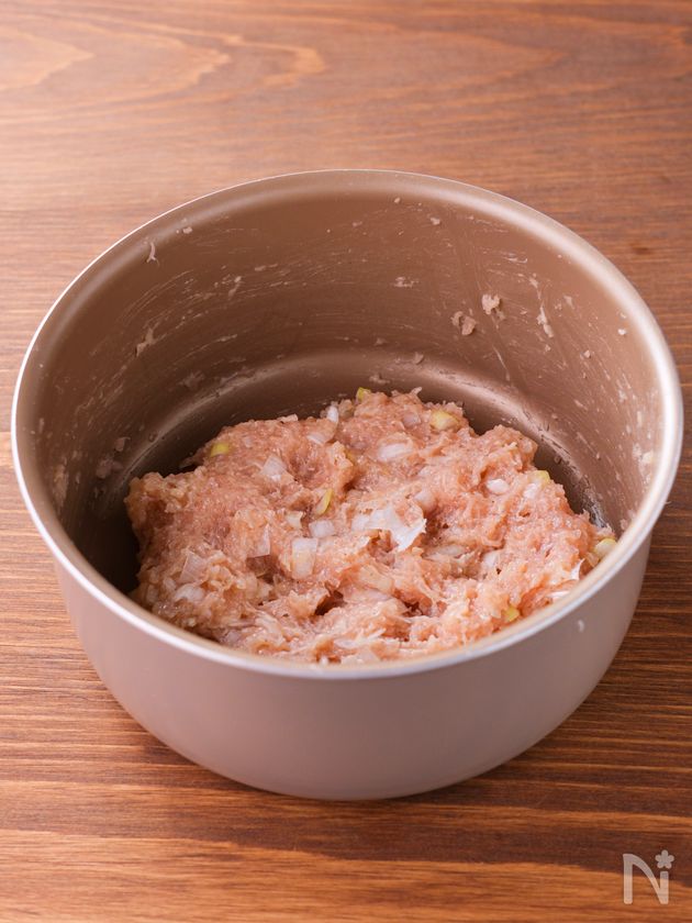 小鍋に長ねぎと【A】を加え、鍋の中でこねる。