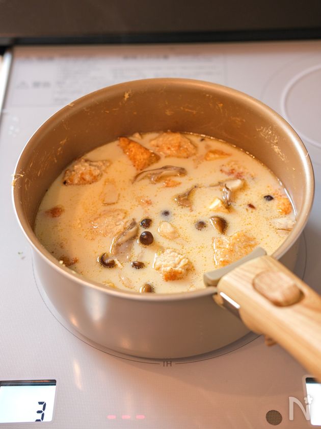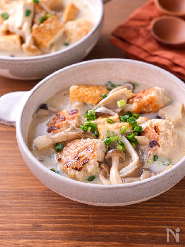 【鶏団子と厚揚げときのこの豆乳みそスープ】お鍋ひとつで簡単!