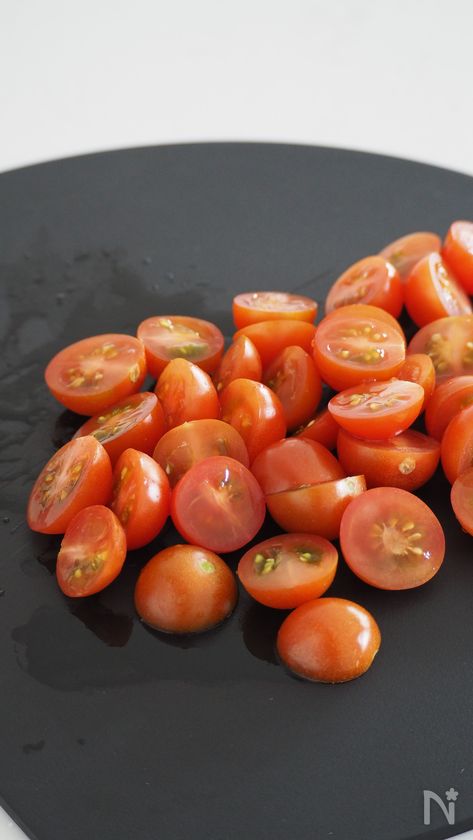 (1) ミニトマトは半分に切る。