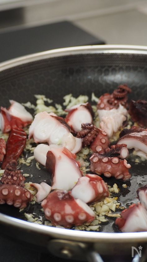 タコを加えてさっと焼き、軽く焼き色がついたら一度取り出す。
