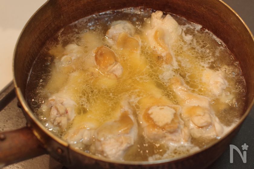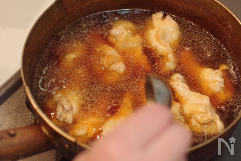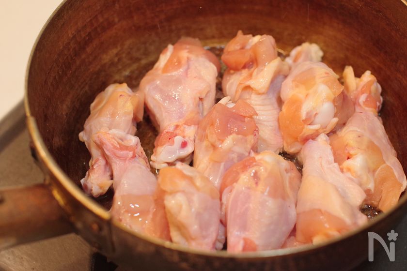 (1) 油をひいたフライパンを中火で熱し、鶏手羽元を両面焼き色がつくまで焼く。(片面3〜4分)
