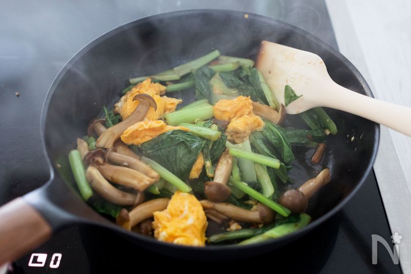 ◯小松菜は火が通りにくい茎→葉の順に入れて炒めます。