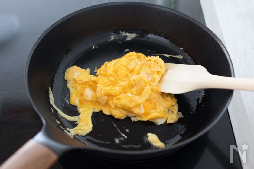 ◯卵は火を止めてからさっと合わせ、ふんわりと仕上げます。