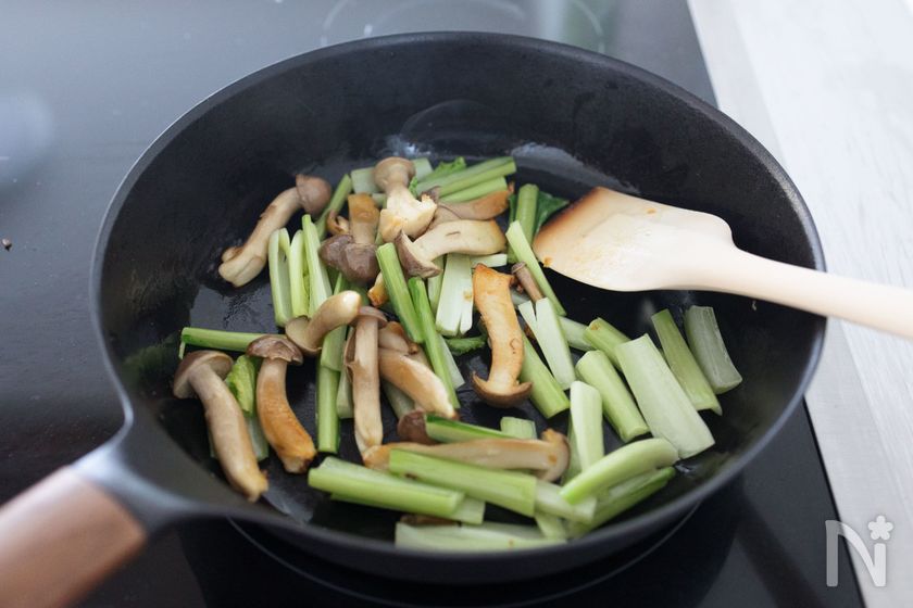 (3) 2のフライパンにサラダ油(小さじ2)を強めの中火で熱し、しめじを軽く焼き色がつくまで炒める。小松菜の茎を加えて10秒程炒め、さらに葉を加えてさっと炒める。