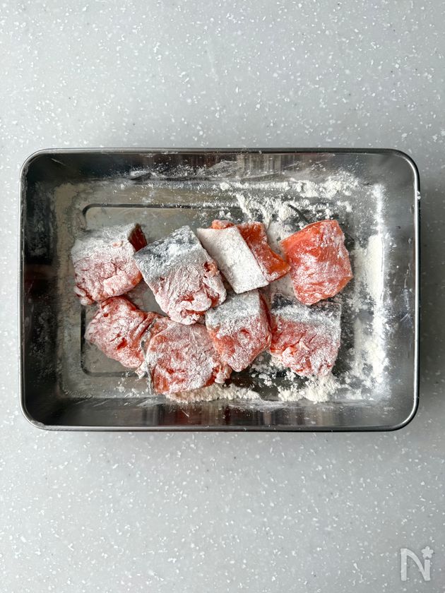 ペーパータオルで水けを拭き取り、小麦粉をまぶす。