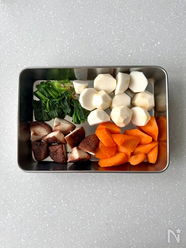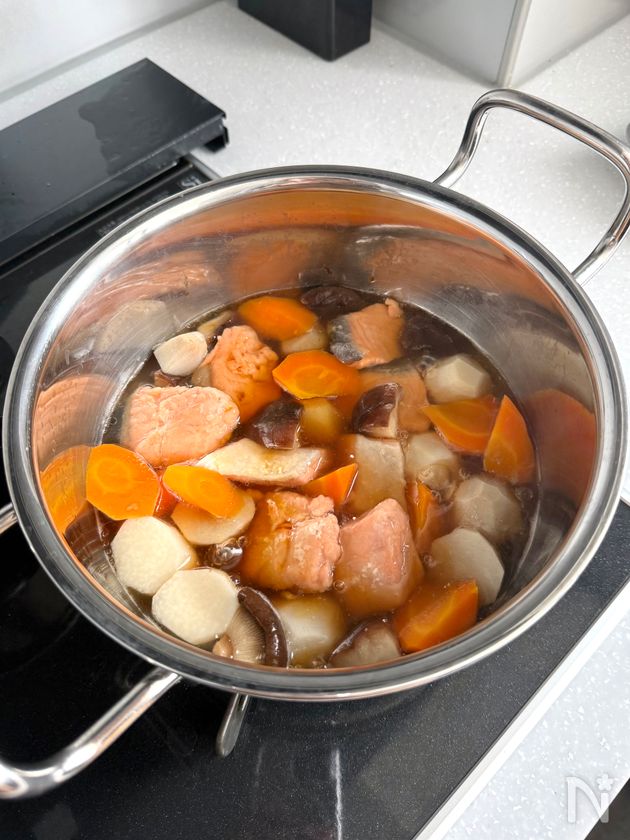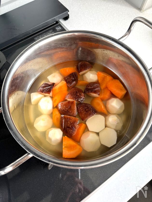 (3) 鍋に【A】と里芋、にんじん、しいたけを入れて沸騰させ、蓋をずらしてのせて弱めの中火で10分煮る。