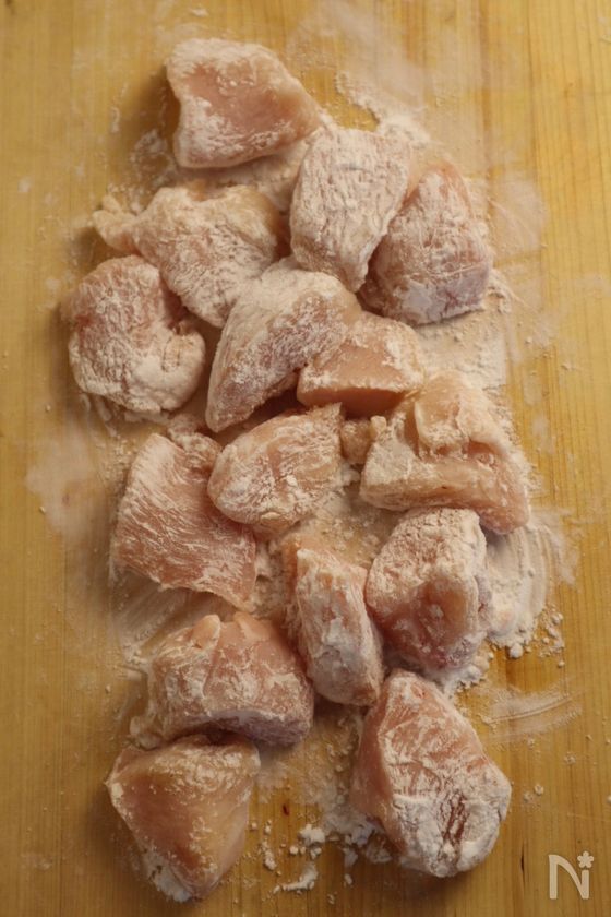 (1) 食べやすい大きさに切った鶏胸肉に塩こしょうをふり、全体に片栗粉をまぶす。