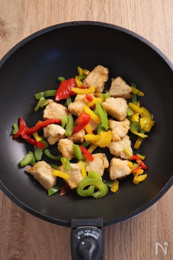 (3) 中火で熱したフライパンに解凍したパプリカ(冷凍)と、揚げた鶏胸肉を入れ、炒める。