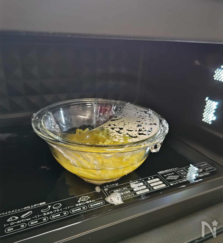 (2) 耐熱ボウルにマカロニを入れ水300mlを加えてラップをして5分加熱する。
