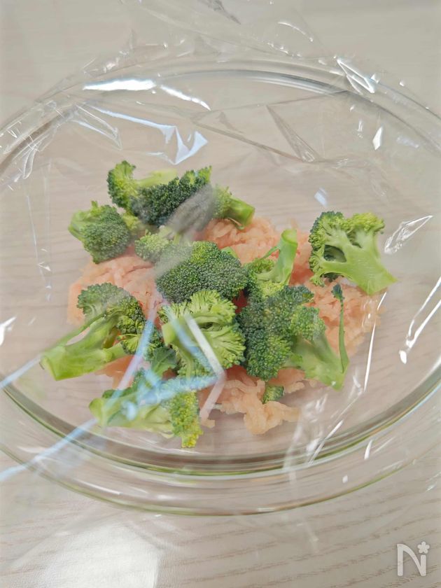 (1) 鶏ひき肉を耐熱ボウルに入れ、その上に、ブロッコリーを小さめに切り分け入れる。ふんわりとラップをしてレンジ600Wで5分加熱する。